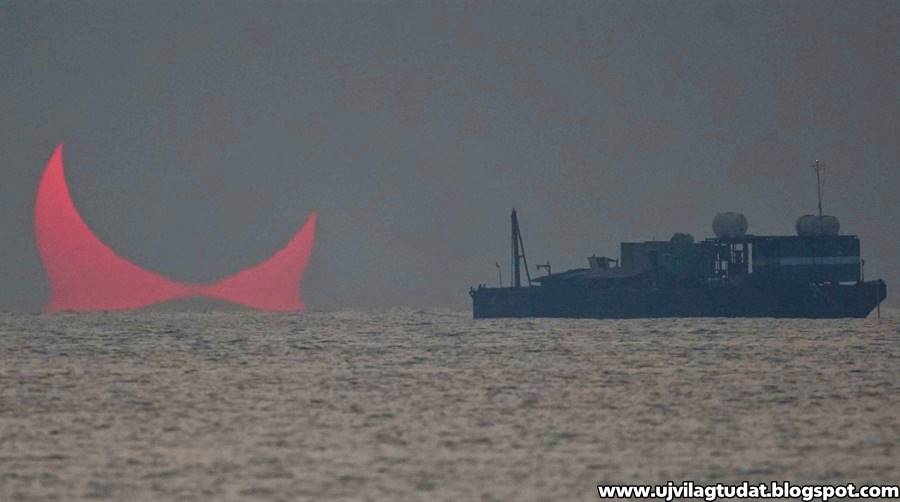 Két óriási vörös szarv, mely a horizont fölé emelkedik a Perzsa-öbölben. Elias Chasiotis fotós készítette a képet Katarban a szokatlan gyűrűs napfogyatkozásról még december 26-án. …